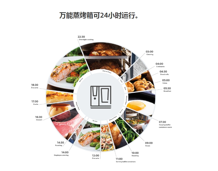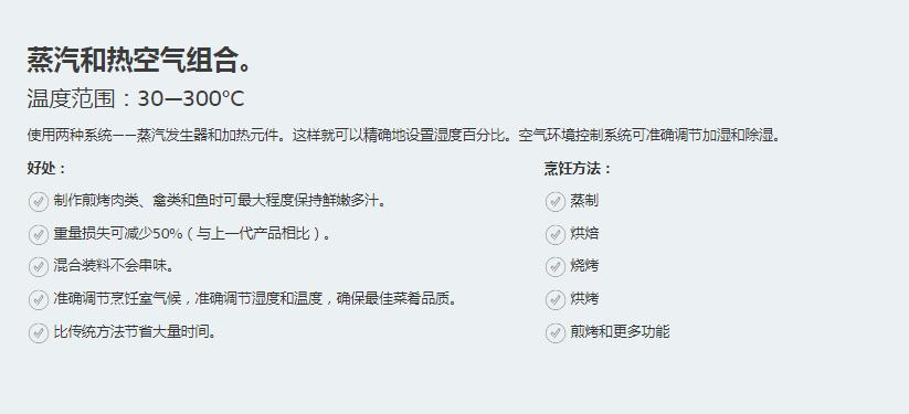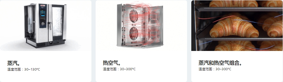 新鮮蒸汽被連續(xù)輸送到烹飪室,再加上熱空氣,這樣就可以在一臺烹飪系統(tǒng)中實現(xiàn)多種烹飪技術(shù):蒸制、烘焙、燒烤、烘烤、煎烤等。因此,廚師只需一臺烹飪設(shè)備就能應(yīng)用各種不同的烹飪方法。