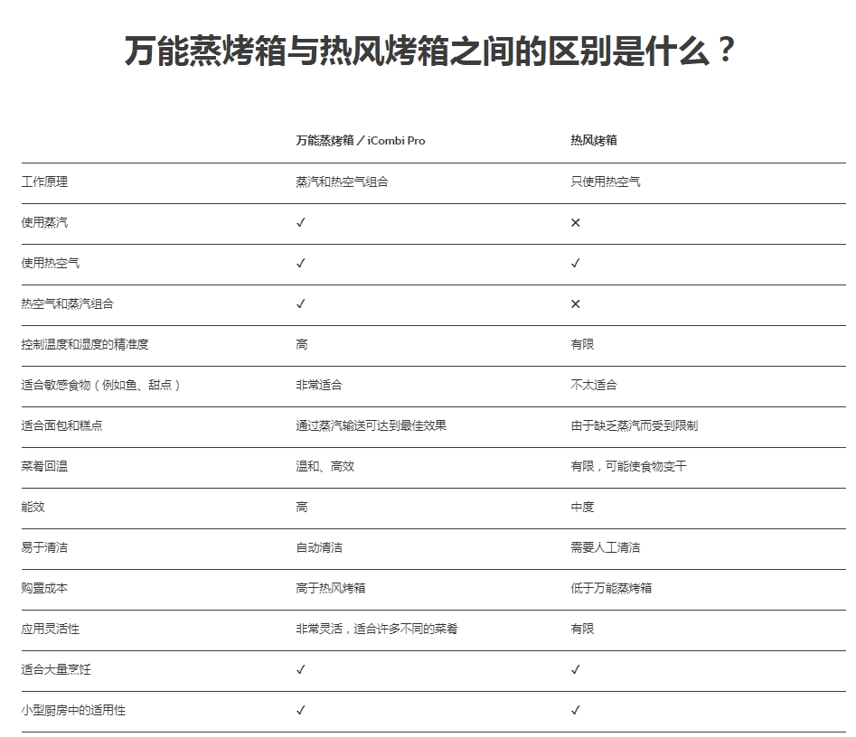 萬能蒸烤箱既可以像對流烤箱那樣進(jìn)行烤制烹飪,也可以像蒸箱那樣蒸熟食物,這兩種方式可根據(jù)需要交替或同時使用。因此,這種設(shè)備適合溫和而快速地煮熟蔬菜和土豆、煎烤和燜燉肉類,也可以烘焙小面包或蛋糕。這使餐飲企業(yè)能夠靈活地烹制各種不同的食物,同時提高經(jīng)濟性和菜肴品質(zhì)。以前的一類設(shè)備是熱風(fēng)烤箱。但這是沒有蒸熟功能的單純的熱風(fēng)循環(huán)烤箱。